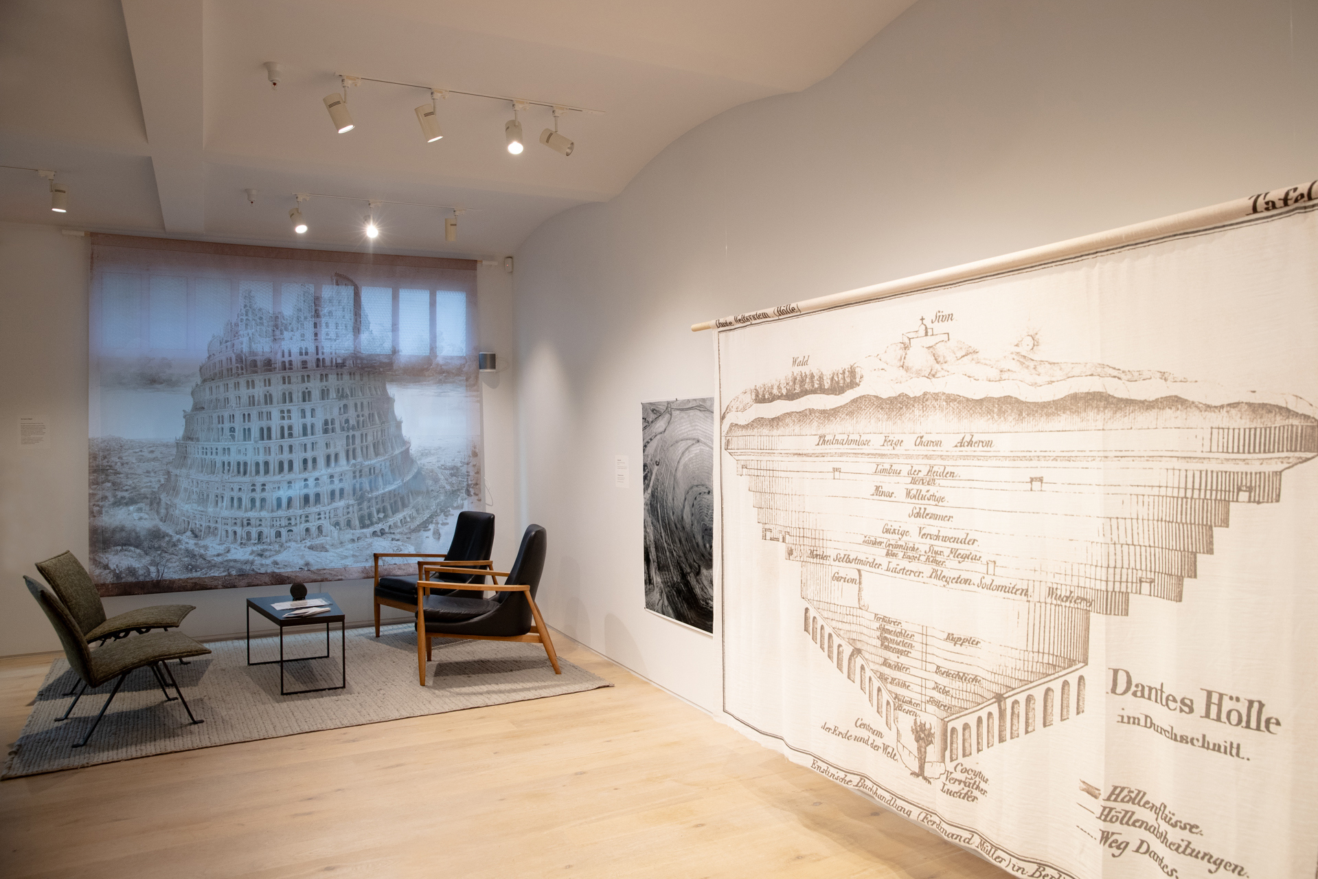 Turn the Tower of Babel upside down, and there is the shape of Dante Alighieri’s inferno. Poli floats a large scale diagram of the architecture of hell in front of his photograph of the Sierra Gorda Copper Mine. Hell could easily fit into the circular pit, like a screw drilling into the hole and sealing it off. The copper mine, in use only since 2014, is inhabited by the trucks seen working in concentric circles at every level. It appears that humans really are building the inferno, with our own drive, hands, ingenuity, and greed.
